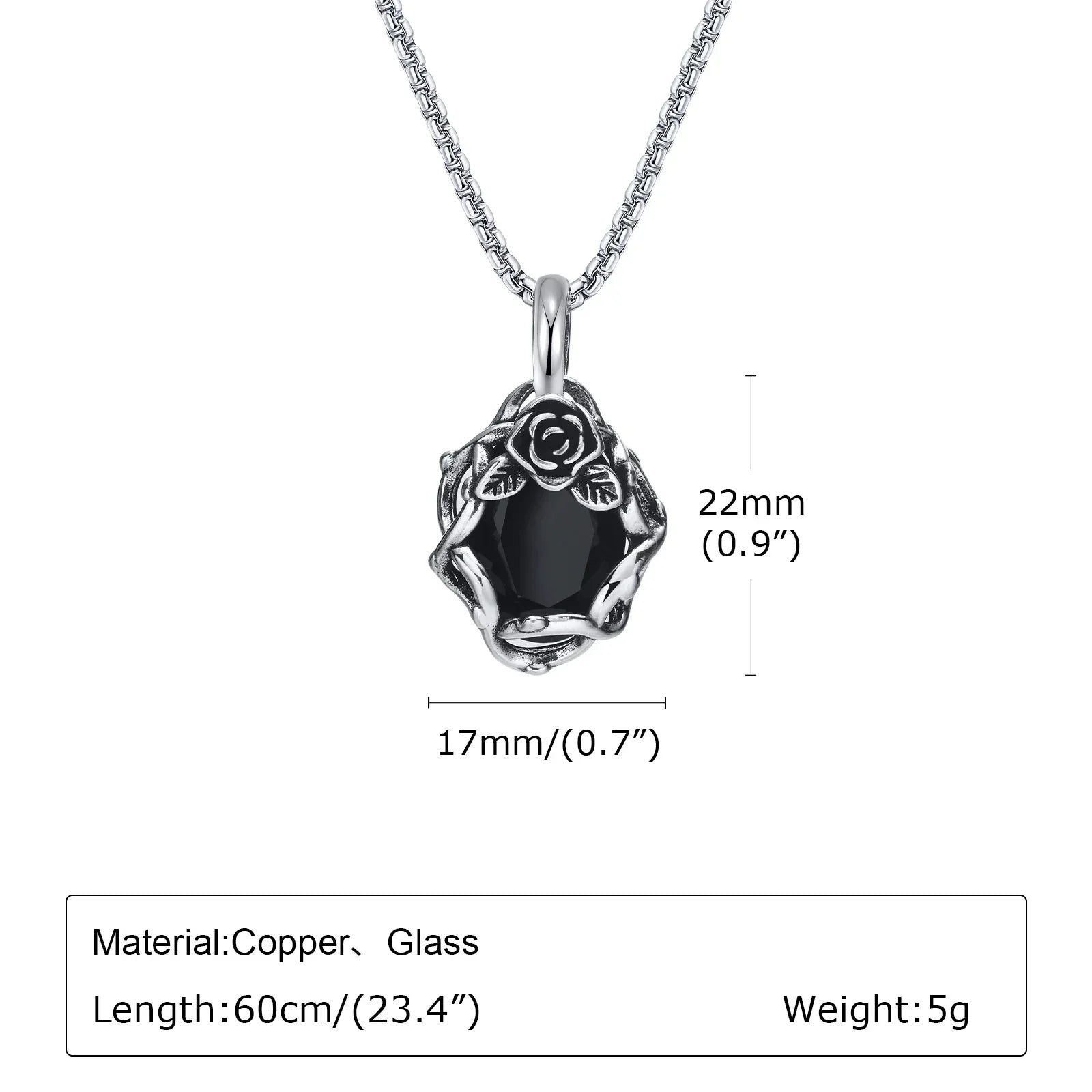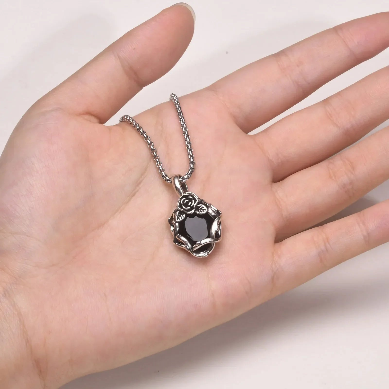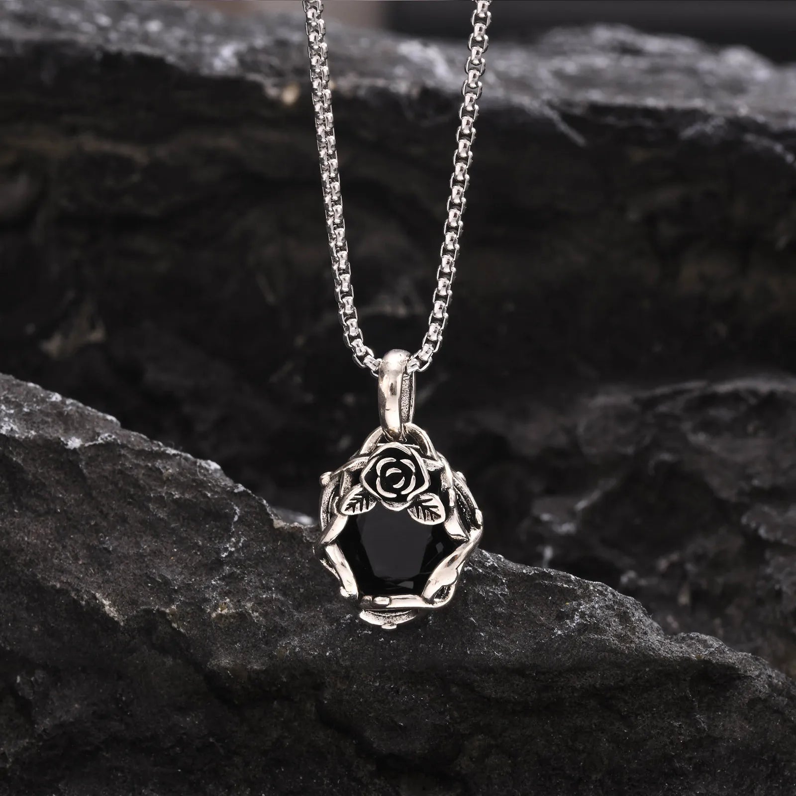 Step into the shadows with the Vnox Goth Black Stone Rose Necklace — featuring a striking thorn flower pendant set with a deep black stone, paired with a sturdy retro-style box chain for both men and women.