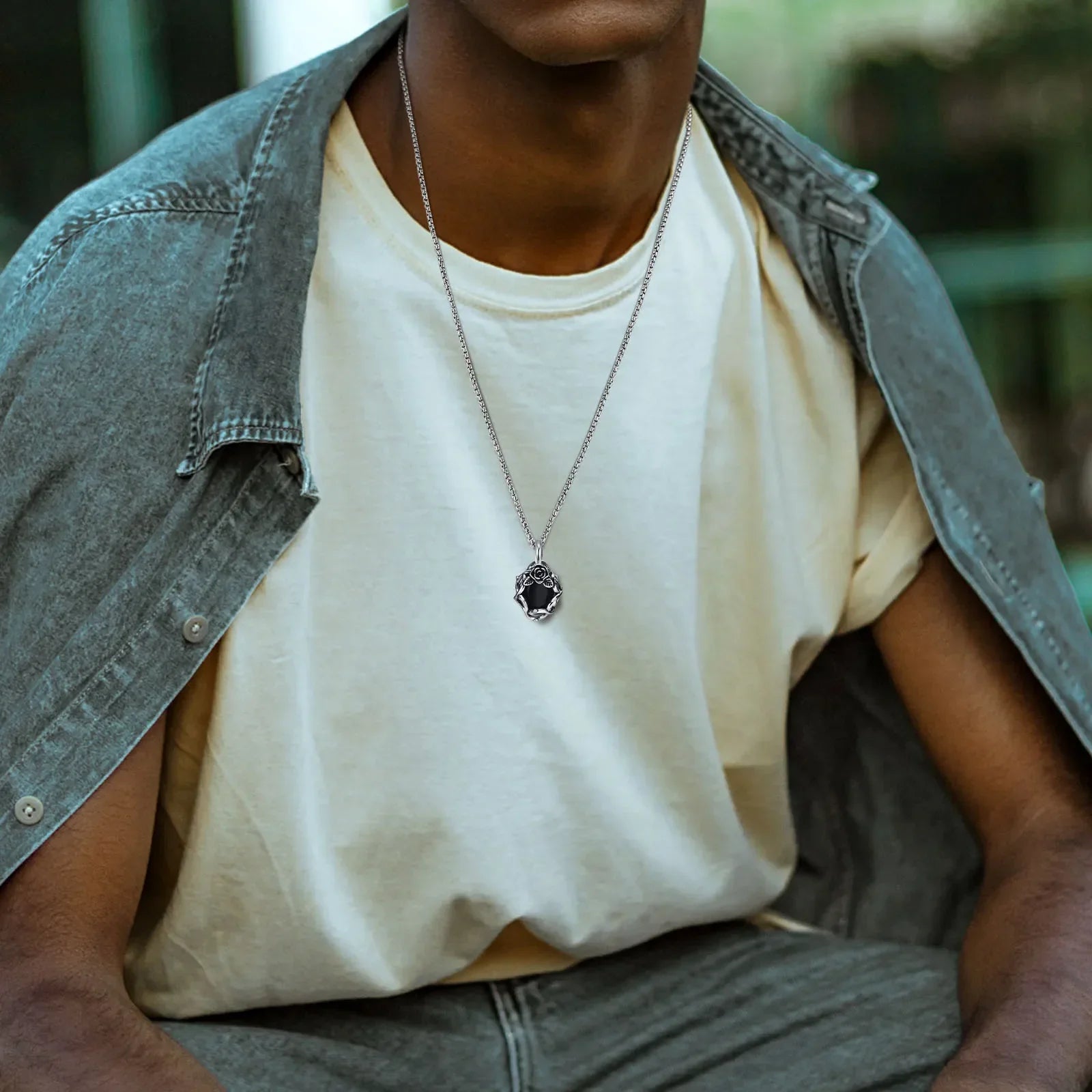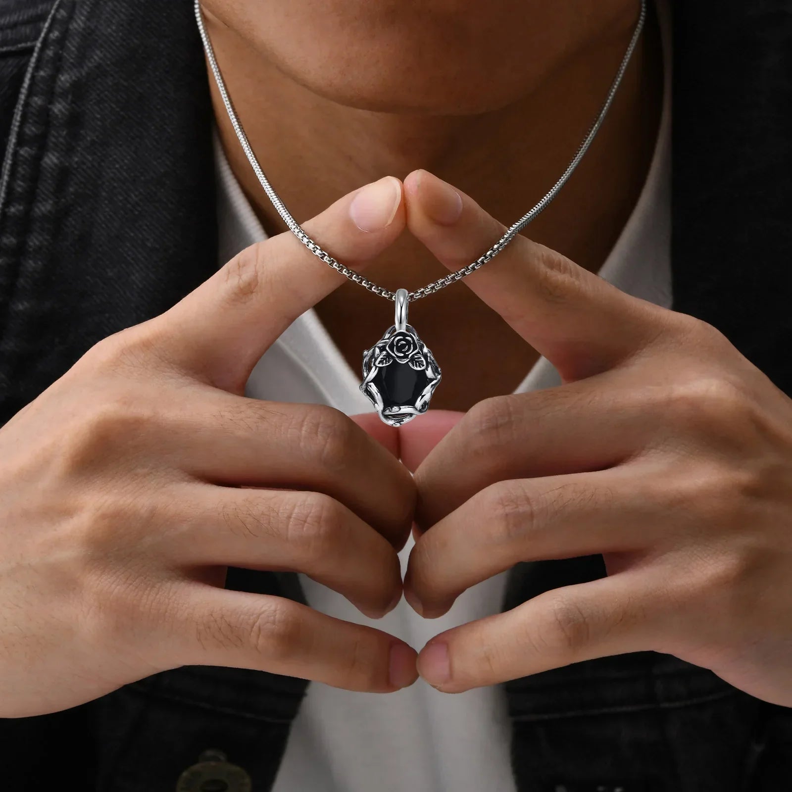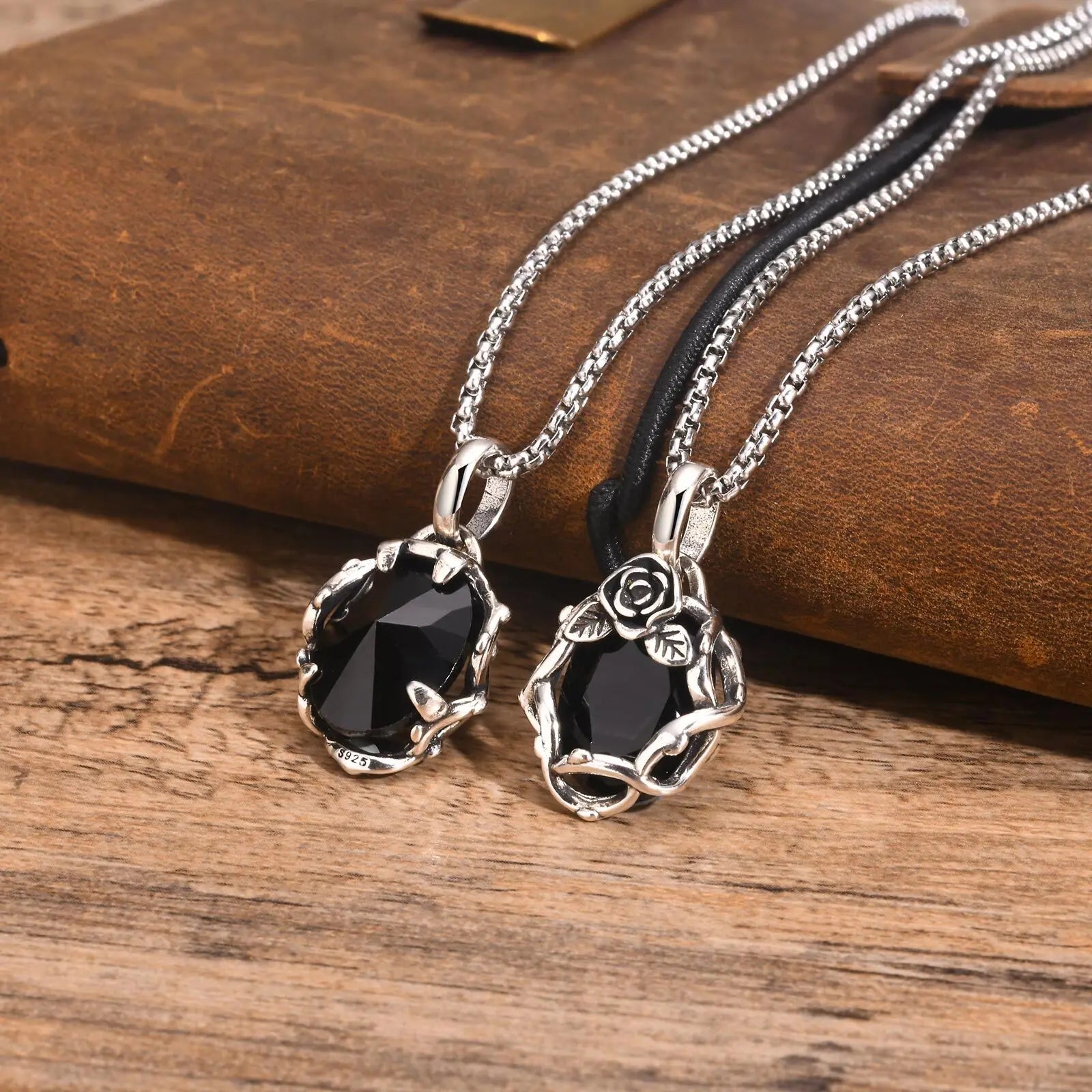 Step into the shadows with the Vnox Goth Black Stone Rose Necklace — featuring a striking thorn flower pendant set with a deep black stone, paired with a sturdy retro-style box chain for both men and women.