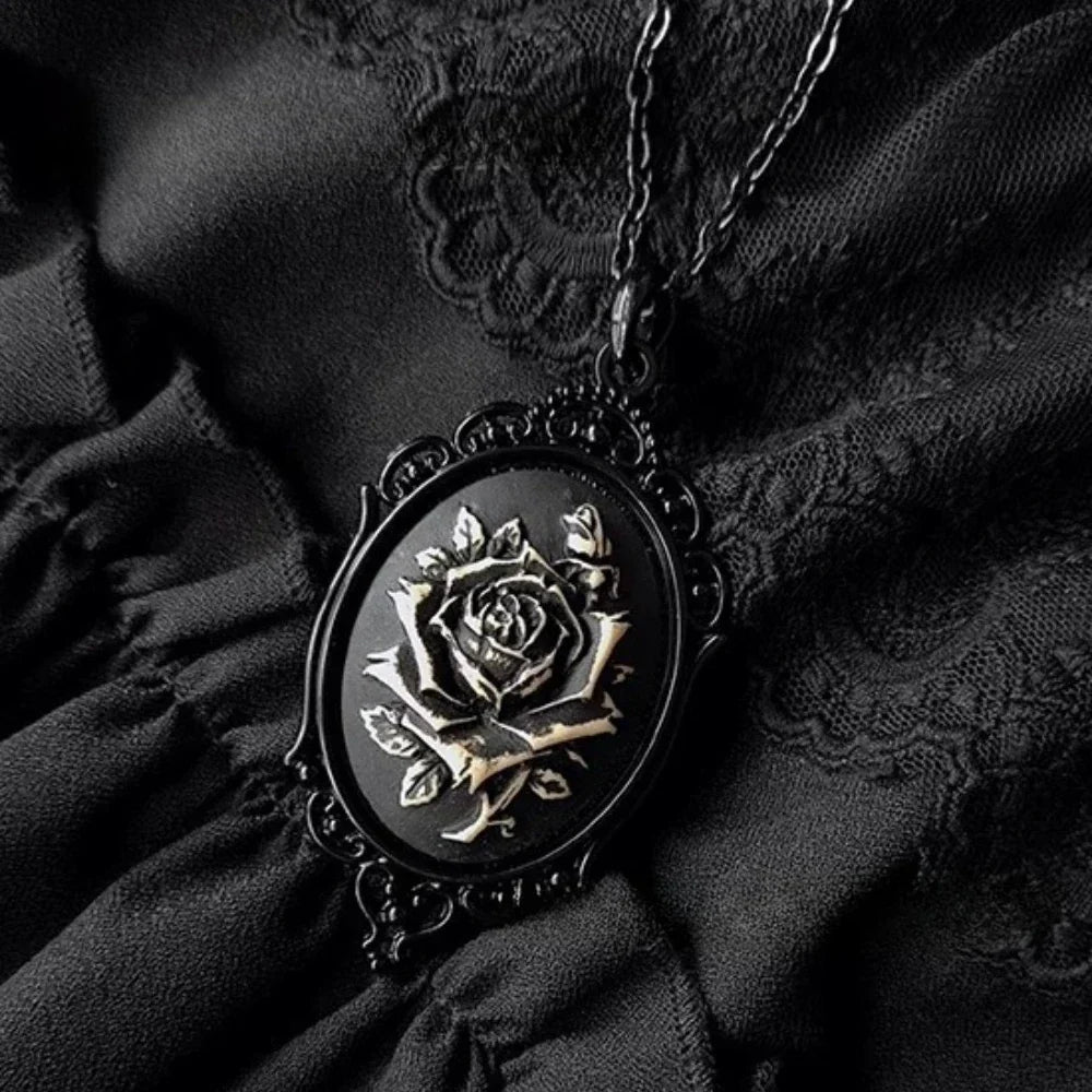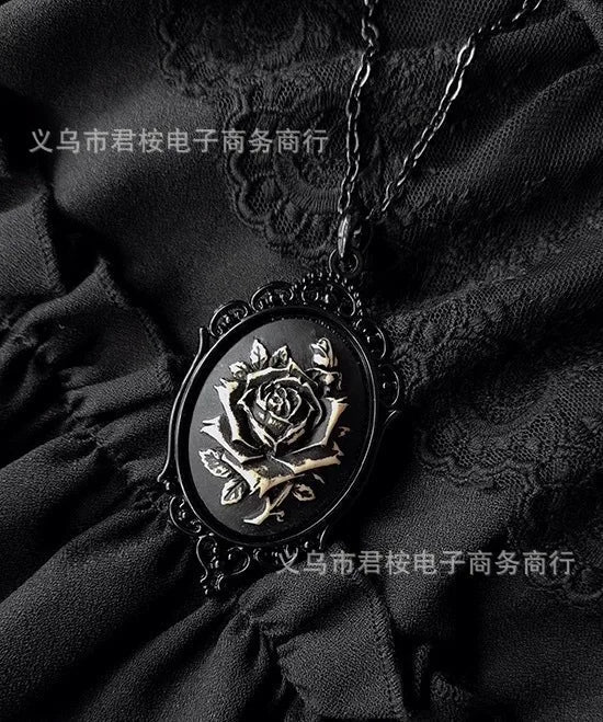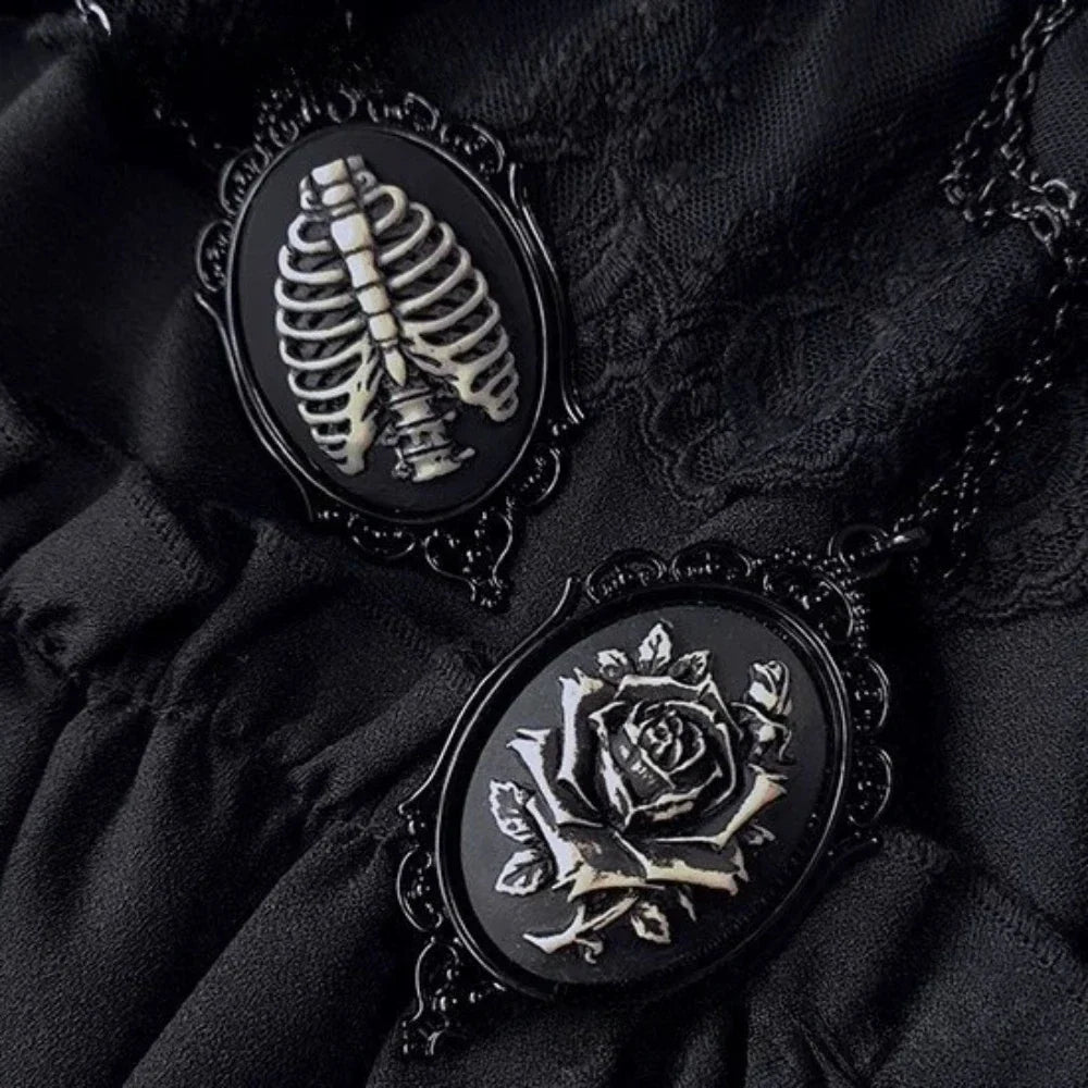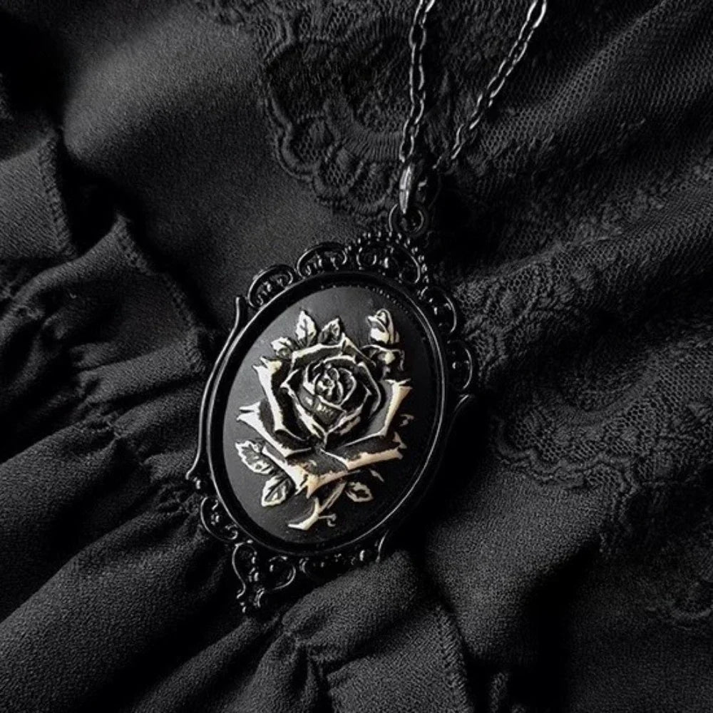 Gothic Black Oval Rose Skull Queen Pendant Necklace – Dark Subculture Jewelry for Women