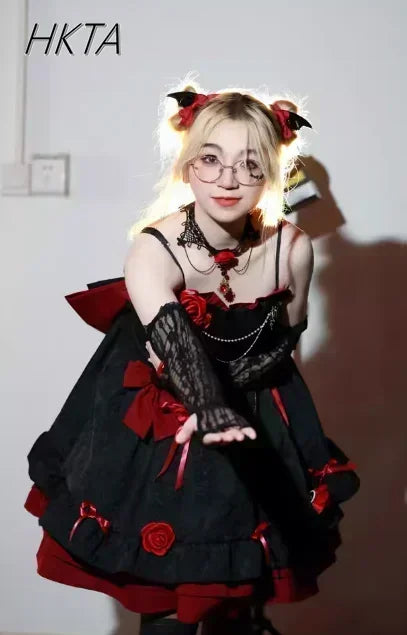 Embrace dramatic elegance with this Gothic Lolita Y2K JSK Dress — a stunning black and red masterpiece with romantic details, perfect for cosplay, birthdays, or living your dark princess dreams.