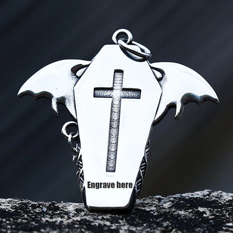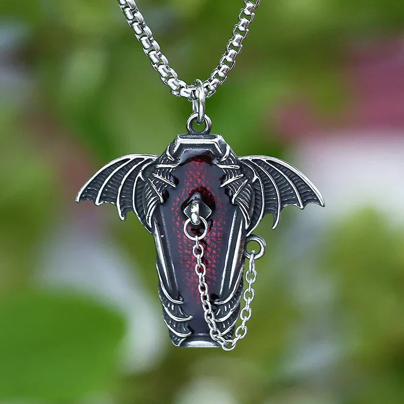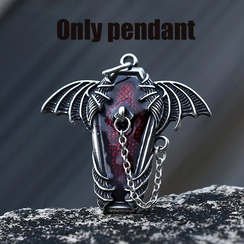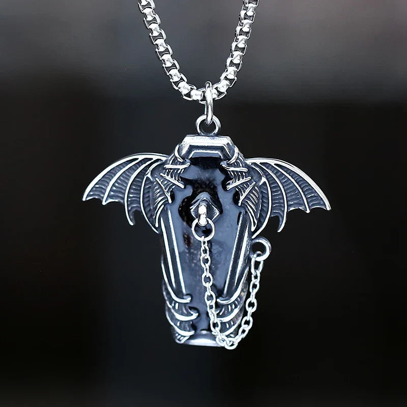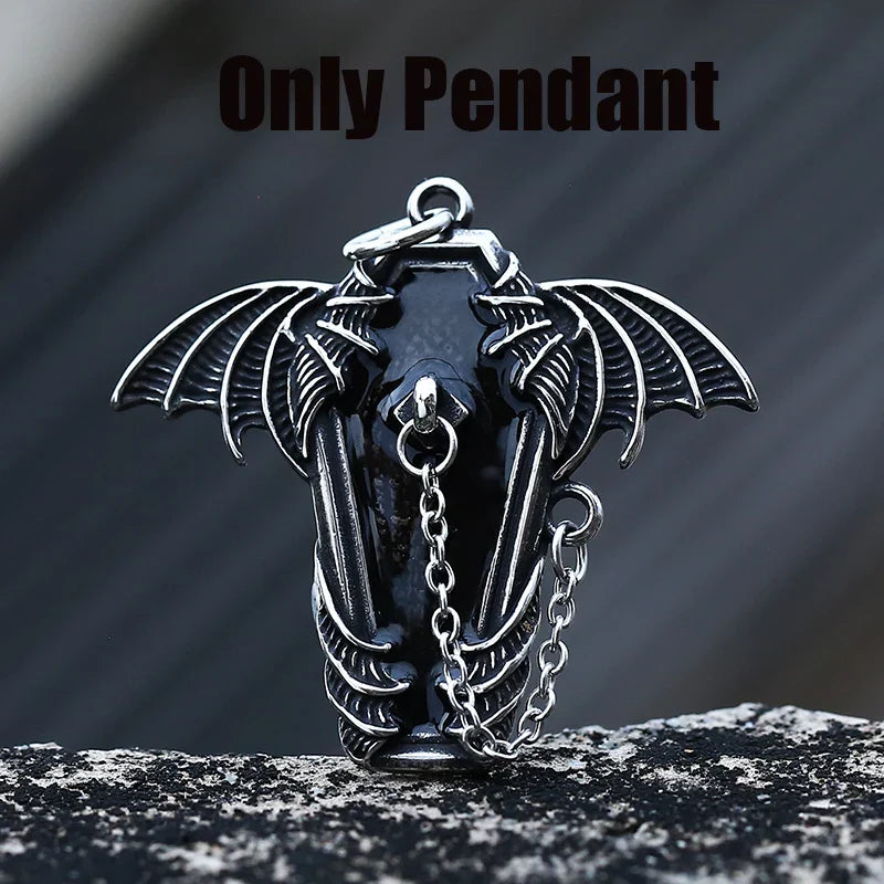 Gothic Coffin with Bat Pendant Necklace – 316L Stainless Steel Punk Biker Jewelry