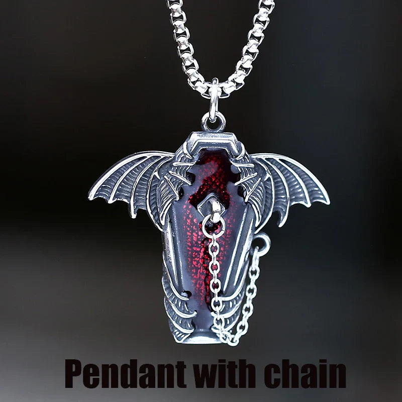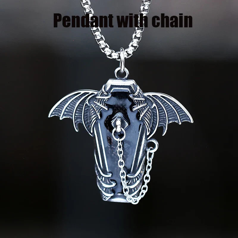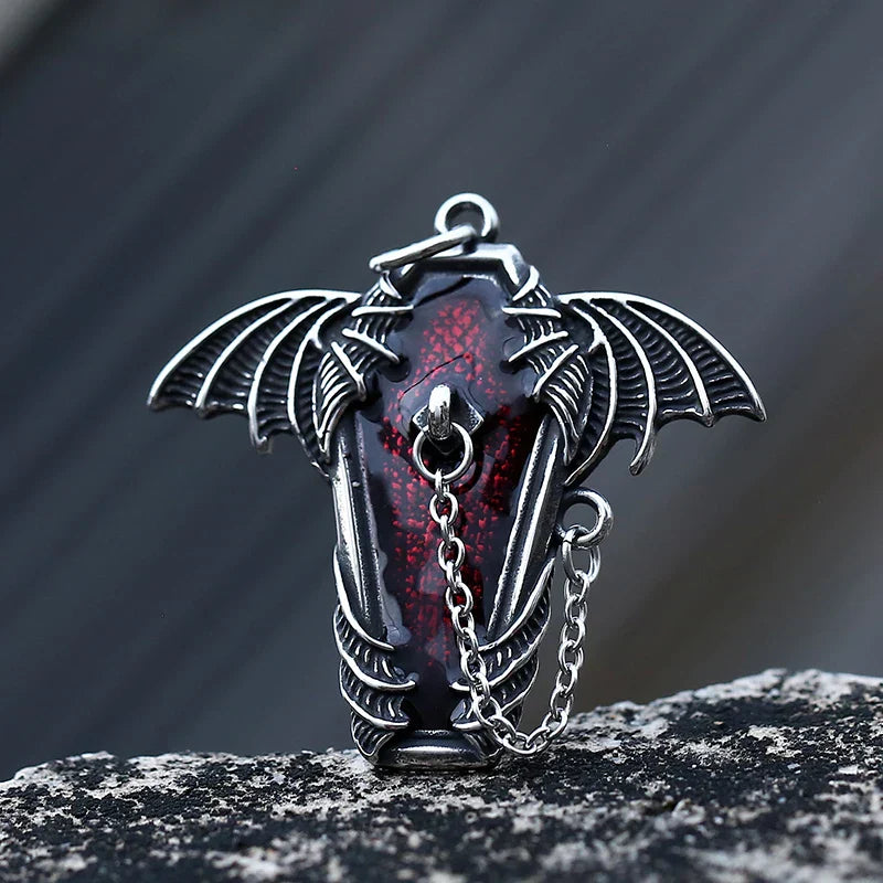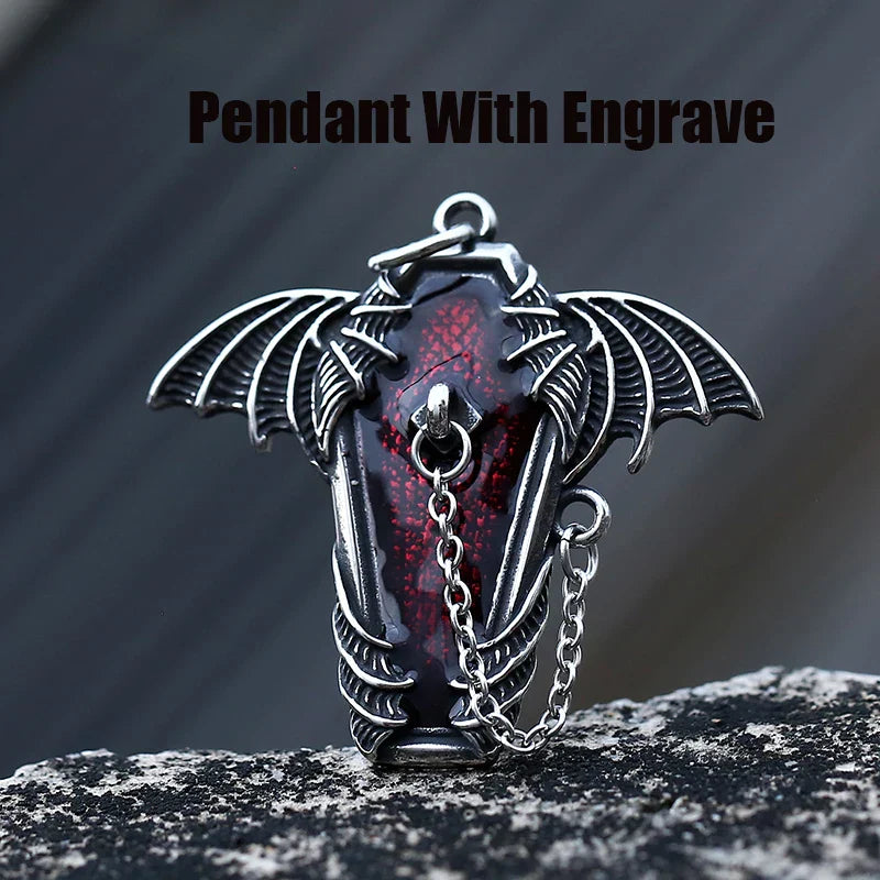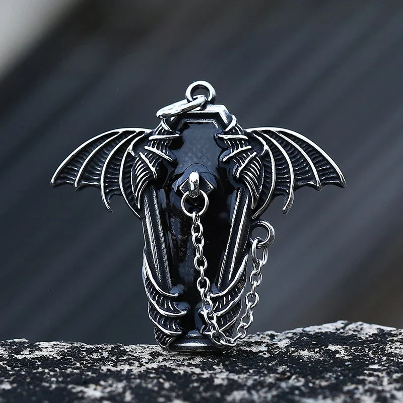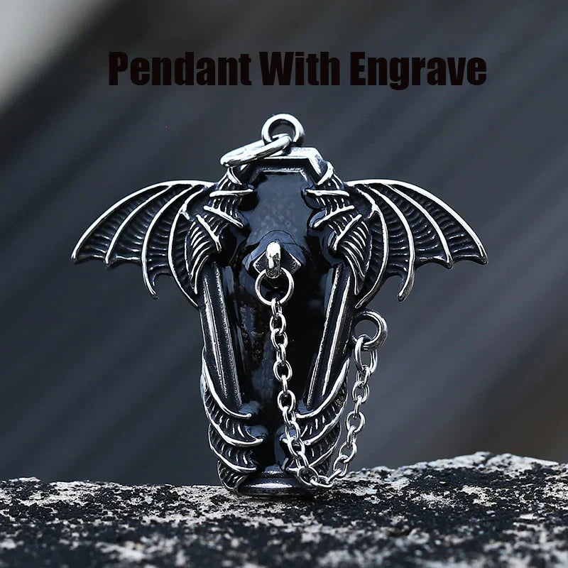 Gothic Coffin with Bat Pendant Necklace – 316L Stainless Steel Punk Biker Jewelry
