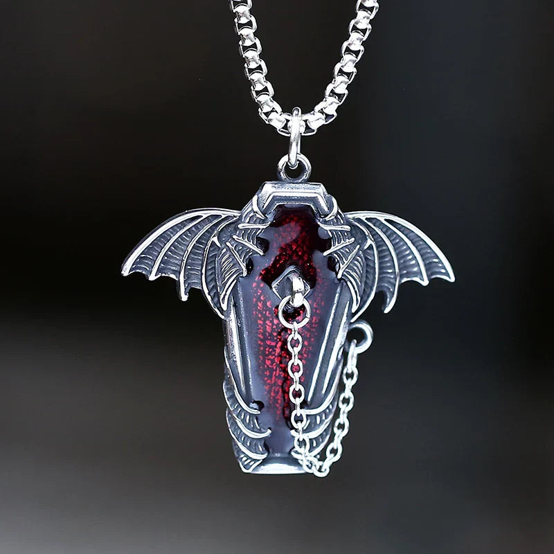 Embrace the dark allure with this Gothic Coffin with Bat Pendant Necklace — a bold accessory for teens, bikers, and punk fashion lovers, perfect as a unique couple gift or gothic statement piece.