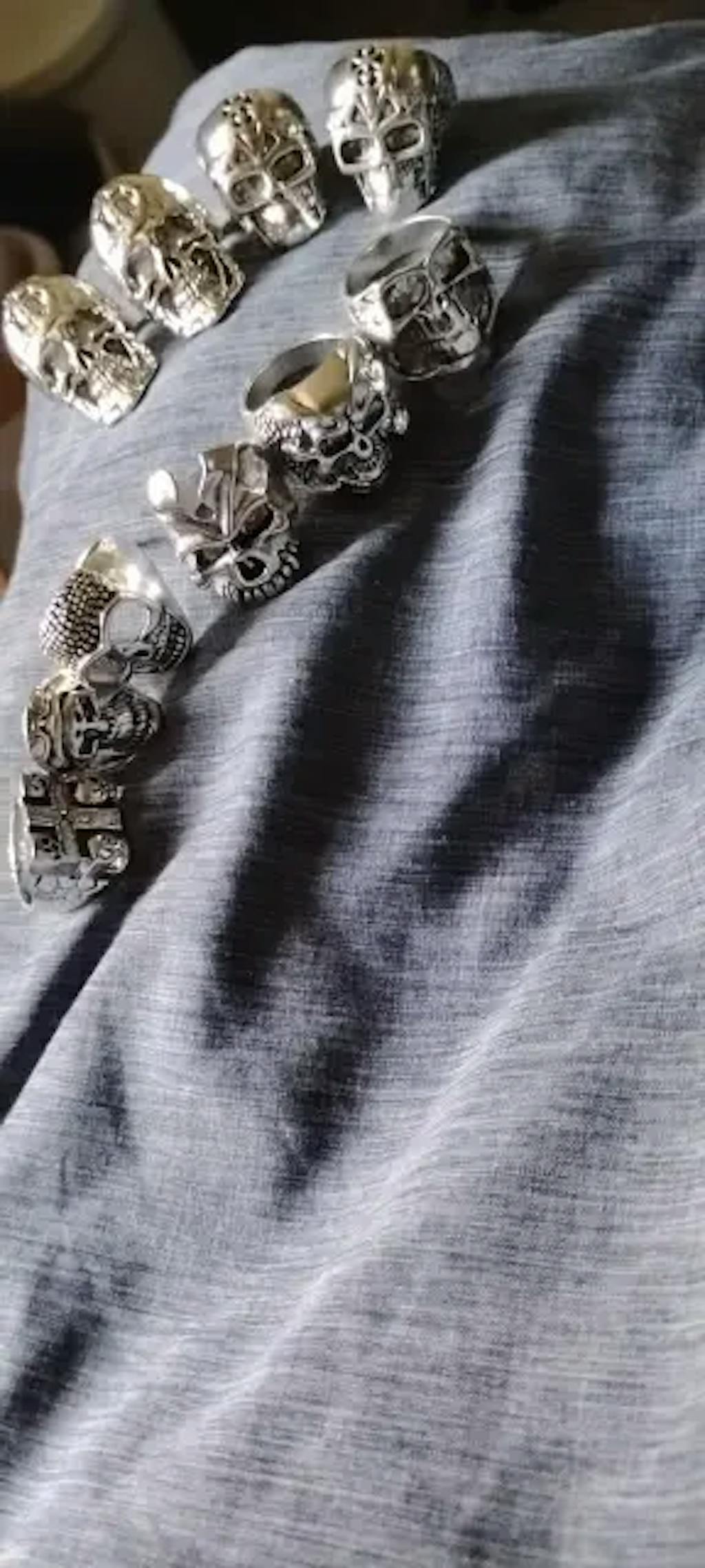 Set includes 10 assorted skull-themed rings: crosses, hollow skeletons, gothic patterns, and more