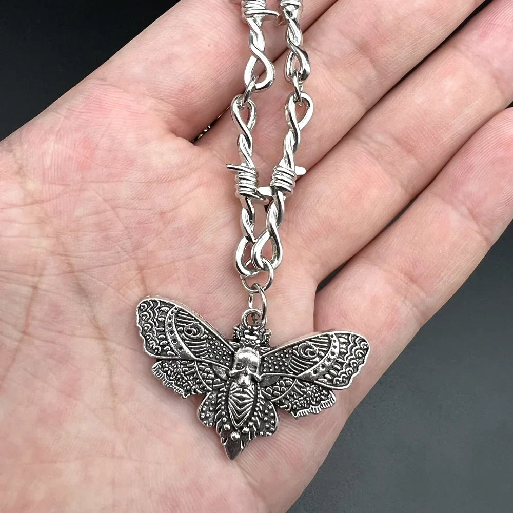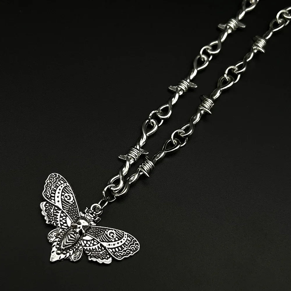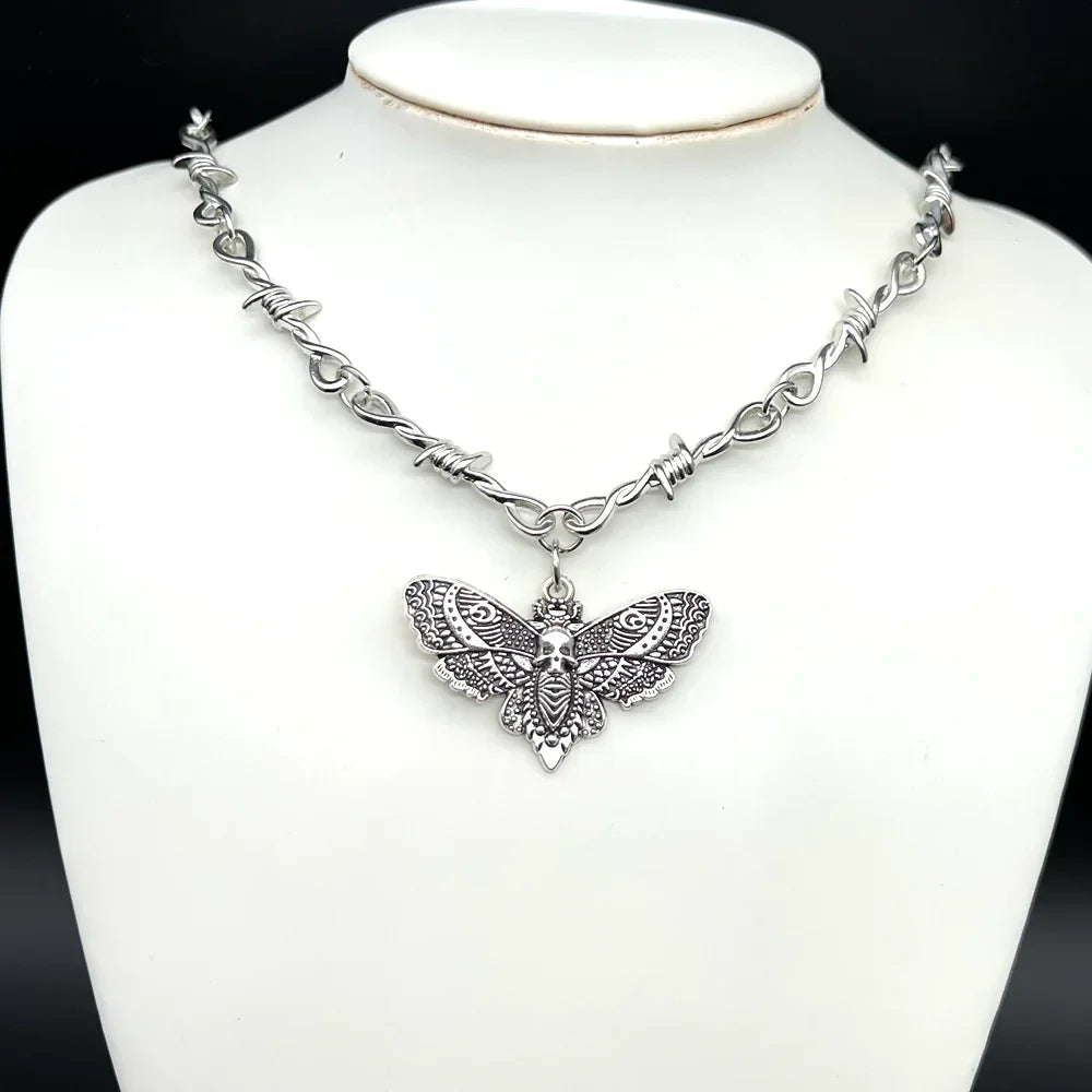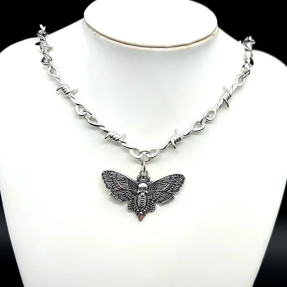 Goth Moth Skull Barbed Wire Cross Pendant Choker Necklace – Punk Hip Hop Y2K Vampire Jewelry