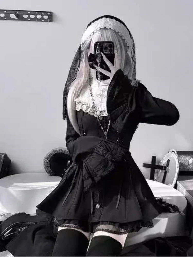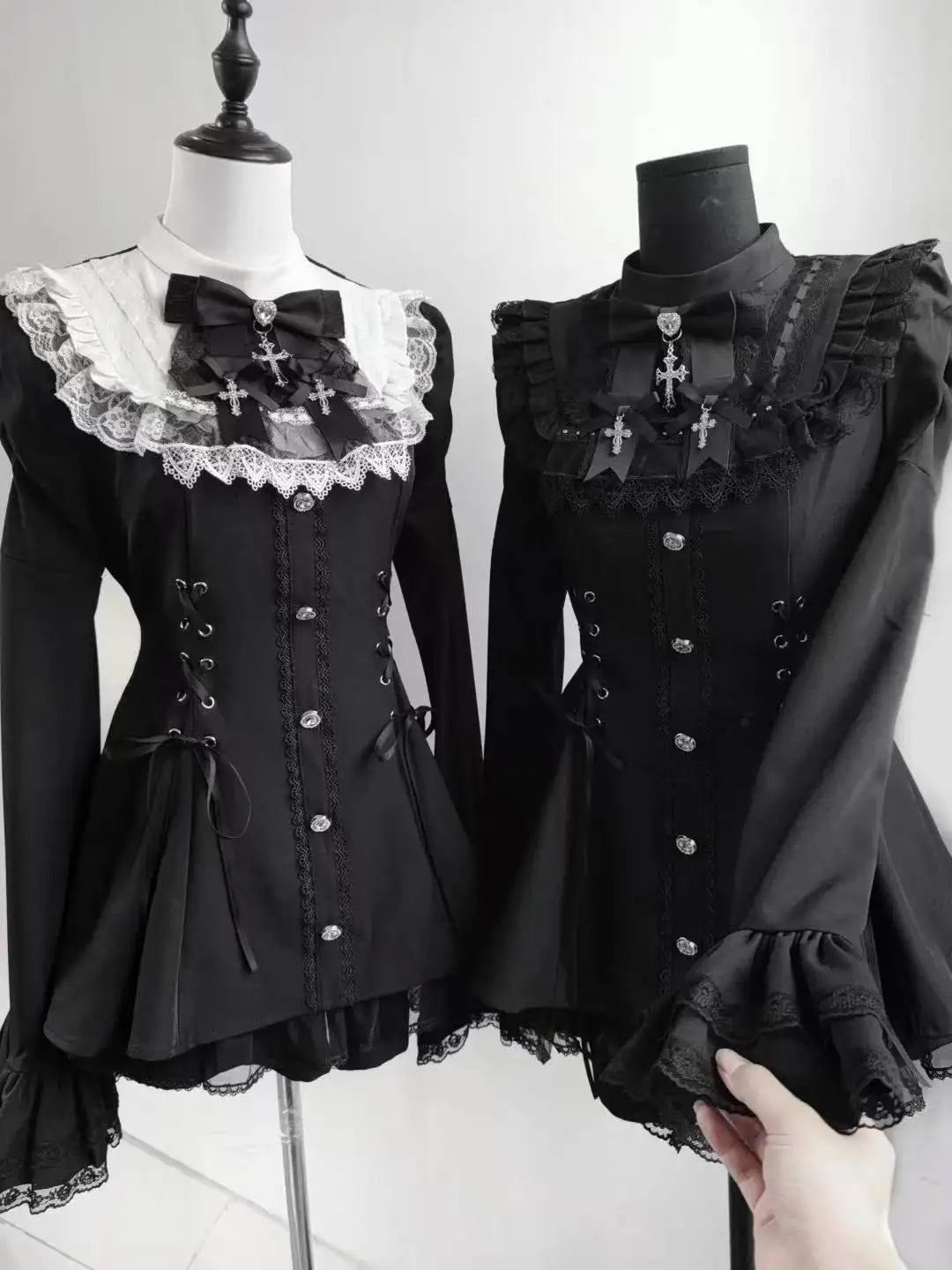Step into a fairytale of dark cuteness with this Japanese Gothic Lolita Dress Set — featuring lace ruffles, ribbon bows, and a charming mini silhouette perfect for Harajuku, Y2K, and party aesthetics.
