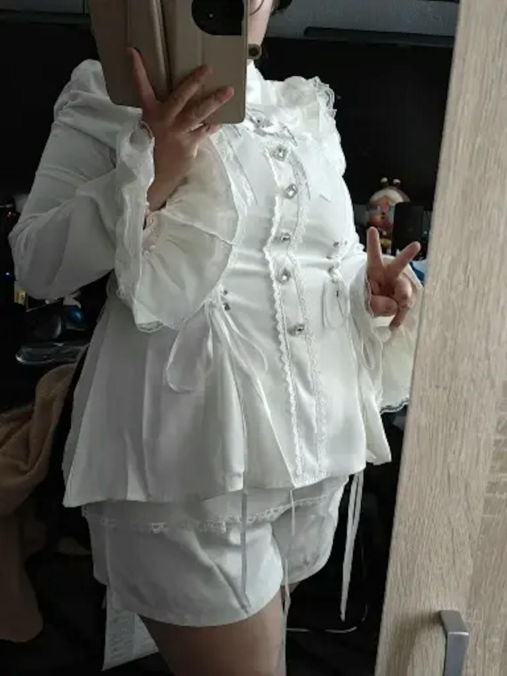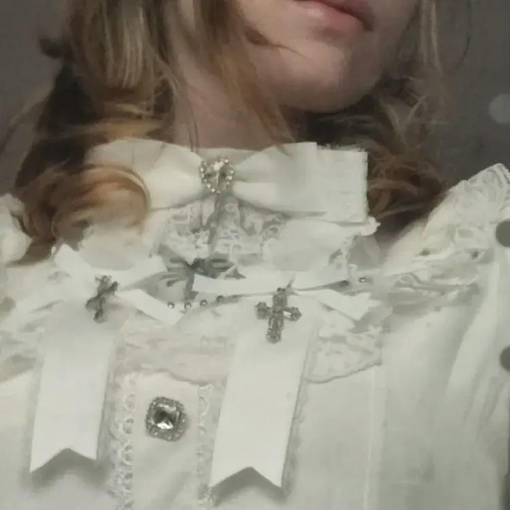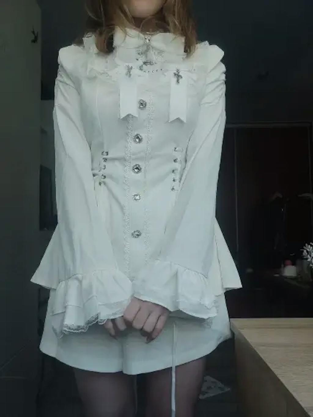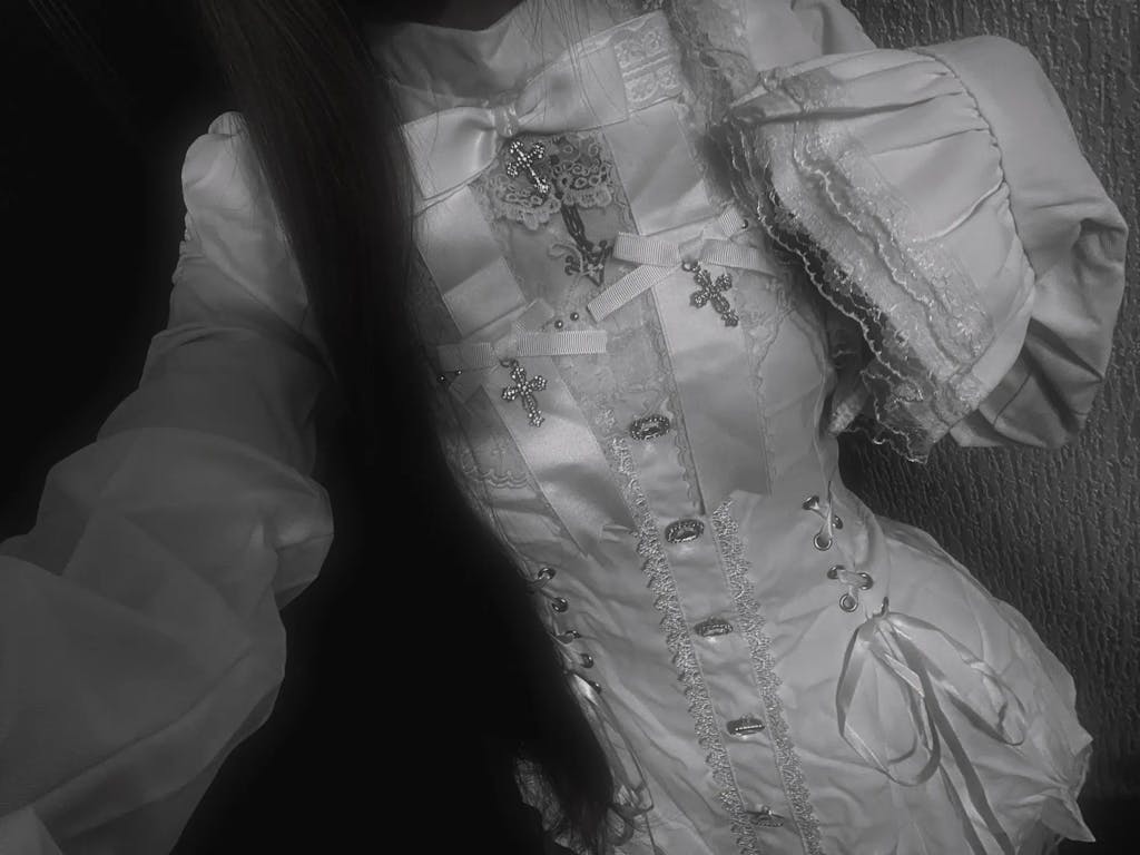 Gothic Lolita style with elegant collar, lace trim, and layered ruffles